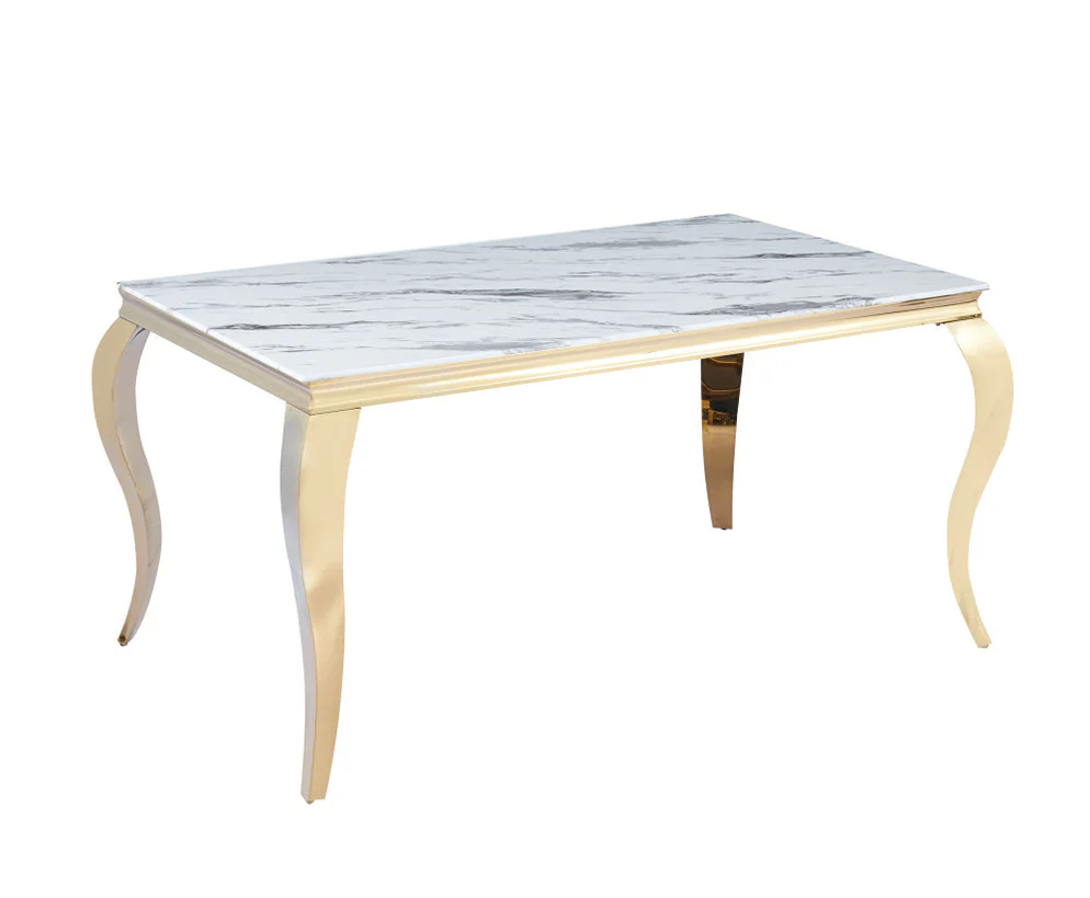 Table à manger BAROQUE 4 à 6 couverts pieds gold plateau en verre 150×90 cm blanc