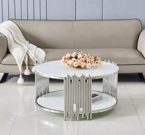 Table Basse ronde STICK Chrome et plateau en verre D90 H45 cm blanc