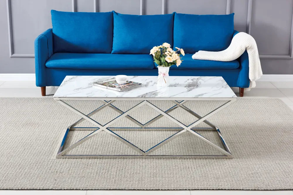 Table Basse TRIANGLE Chrome et plateau en verre 120×60 cm marbré blanc